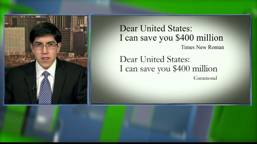 Using the General Services Administration's estimated annual cost of ink -- $467 million -- Suvir concluded that if the federal government used Garamond exclusively it could save nearly 30% -- or $136 million per year. An additional $234 million could be saved annually if state governments also jumped on board, he reported.